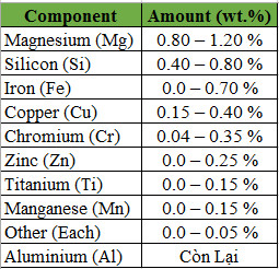 ◦ Nhôm 6061 là một hợp kim đa dụng tuyệt vời, có độ bền cao, chống ăn mòn tốt và có tính hàn tốt. Nó được sử dụng cho tất cả các ứng dụng kết cấu chẳng hạn như hàng không, bán dẫn, đồ gá lắp và cố định. Nó có thành phần chủ yếu là nhôm, magiê và hợp kim silicon.